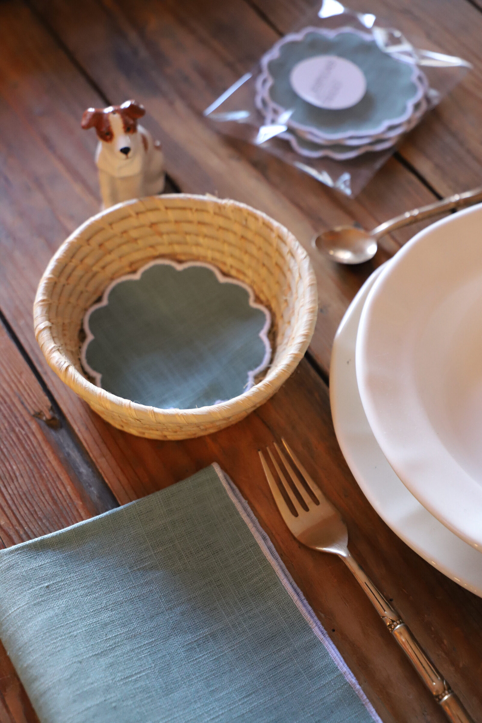 El lino natural ofrece una textura suave y duradera, perfecta para mantener el pan fresco por más tiempo. El ribete curvy en contraste, disponible en una gama de colores llamativos, en este caso azul claro y blanco, le da un toque distintivo a cada pañito, haciéndolos resaltar en tu espacio culinario.