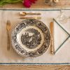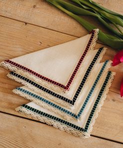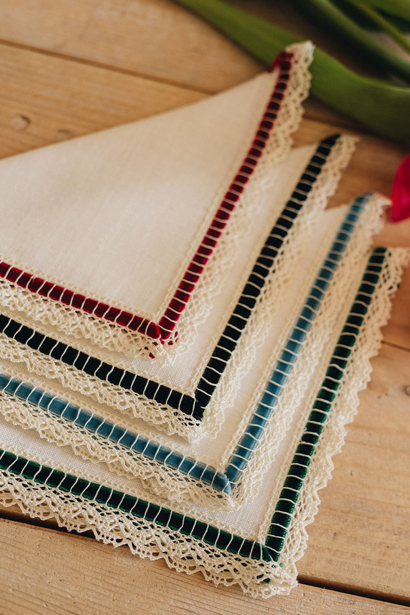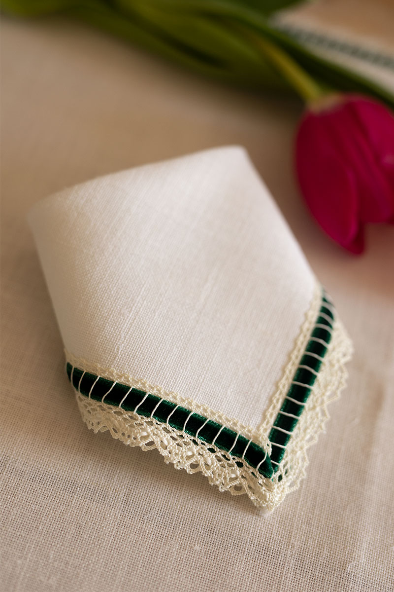 Servilleta color hueso con acabado en encaje y tercioepelo verde.