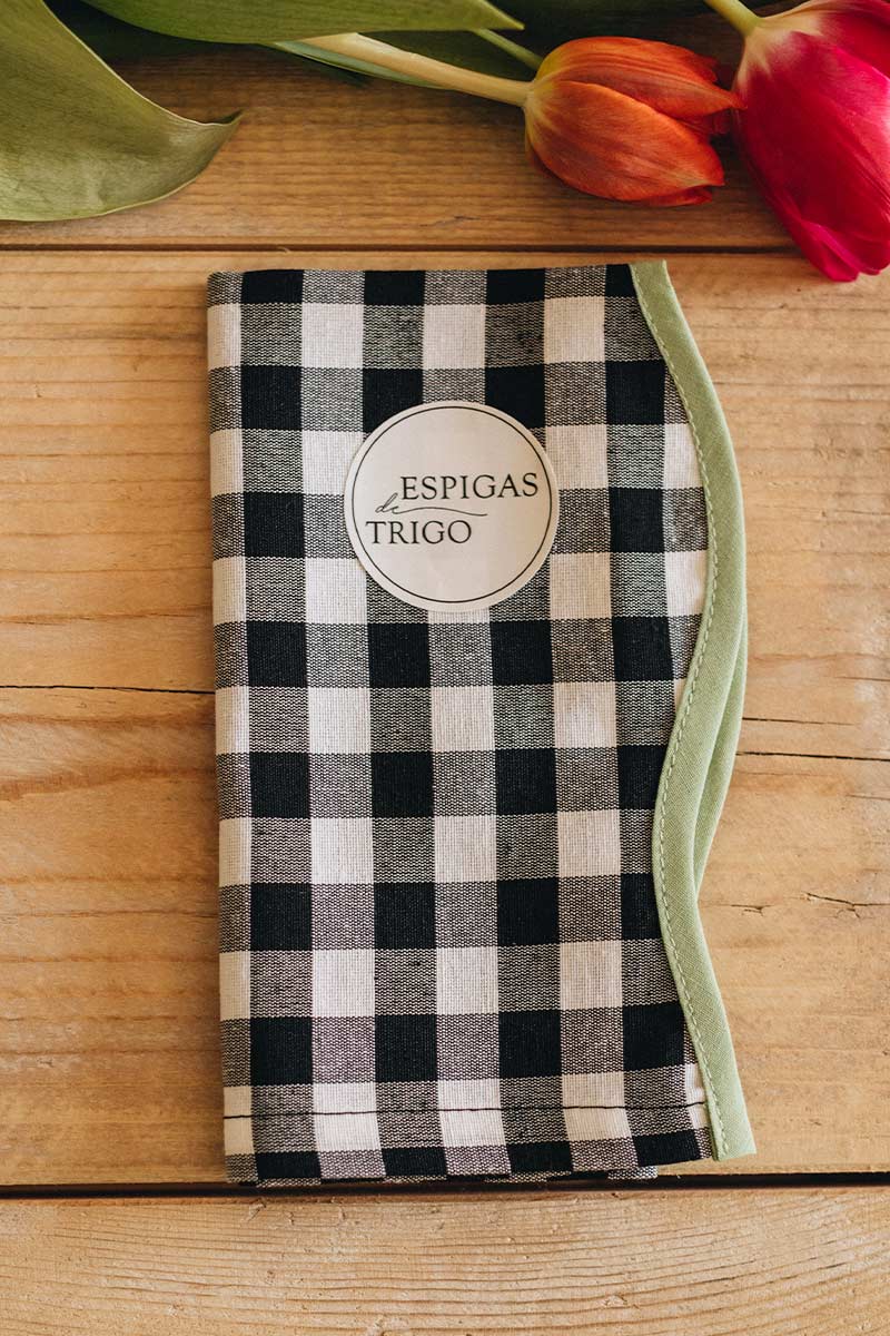Servilleta de mesa en vichy blanco y negro con curvy de color verde mint.