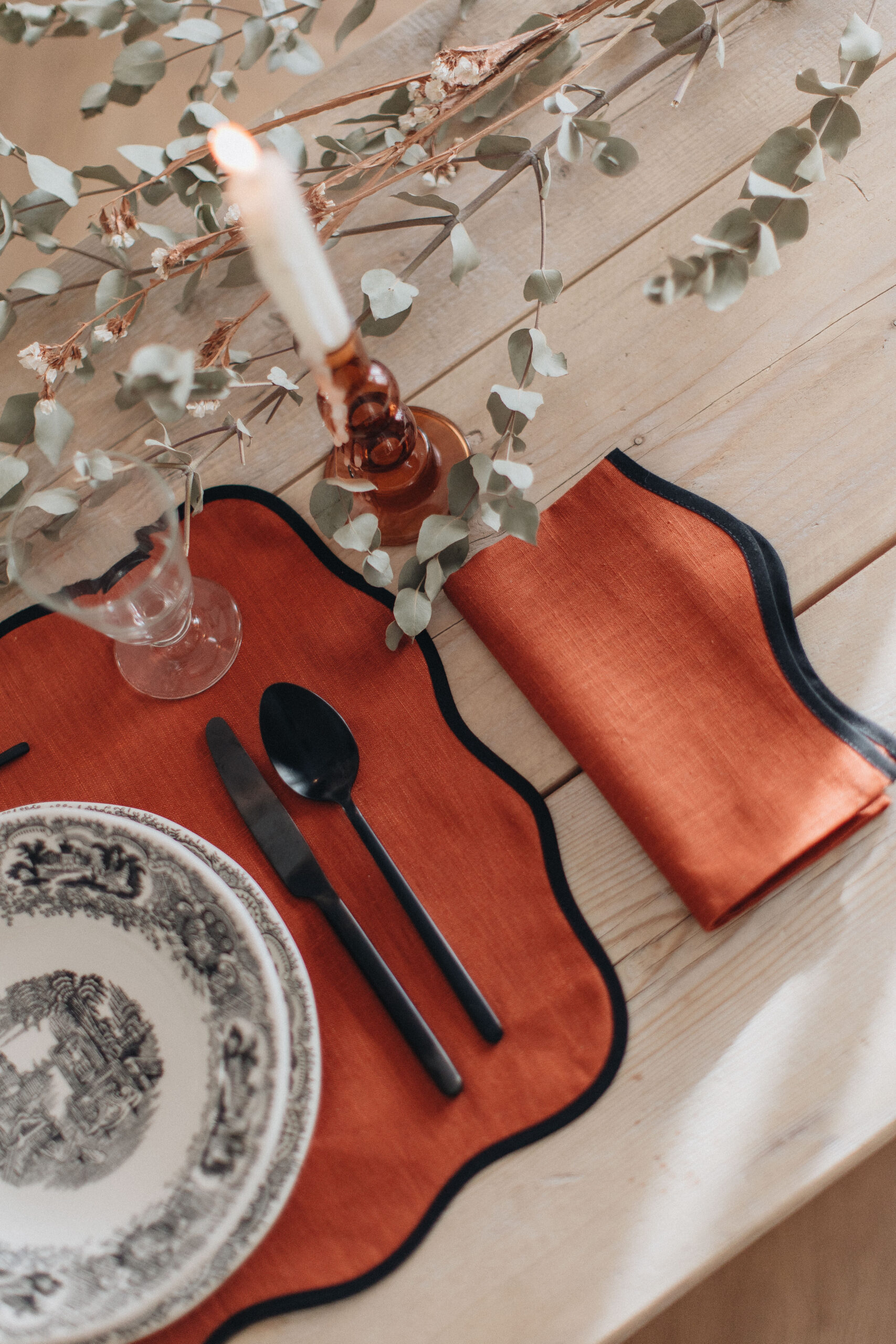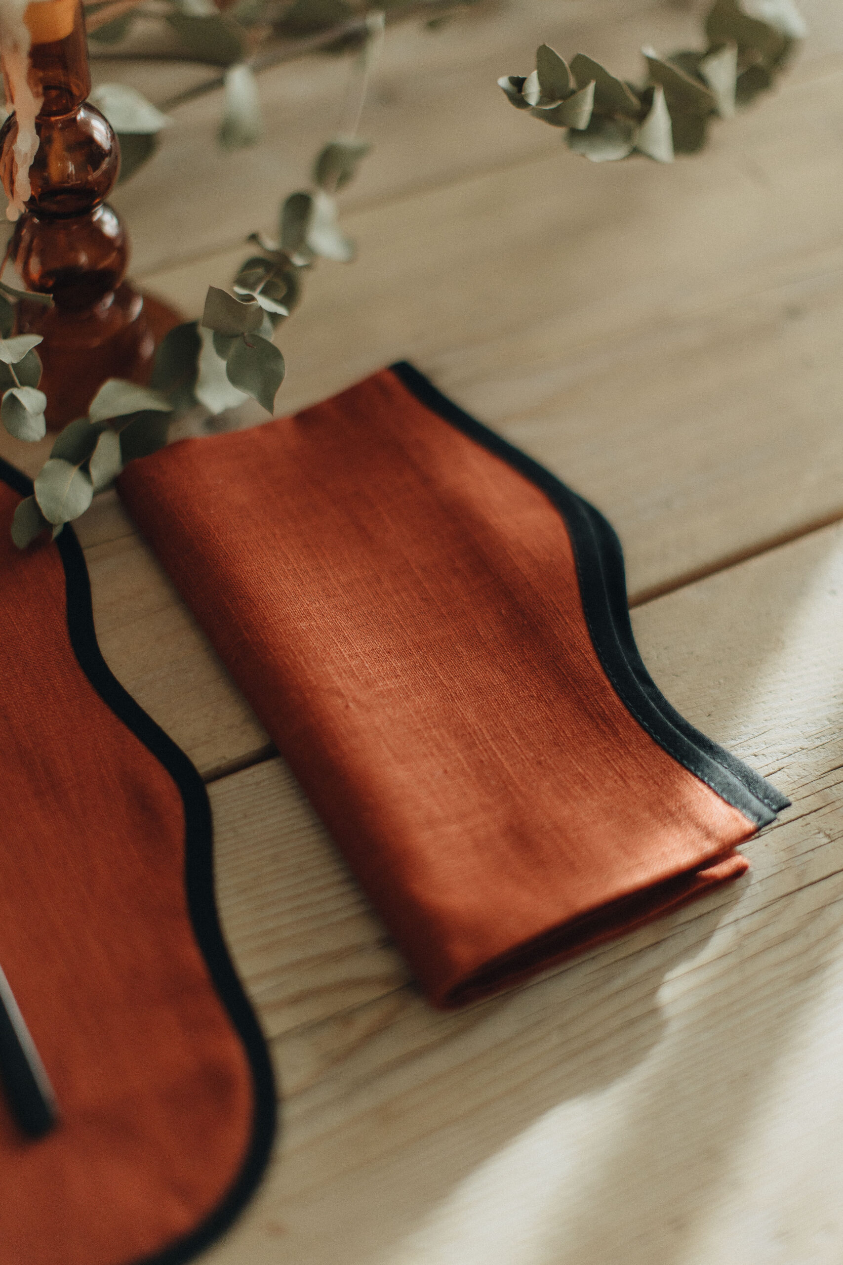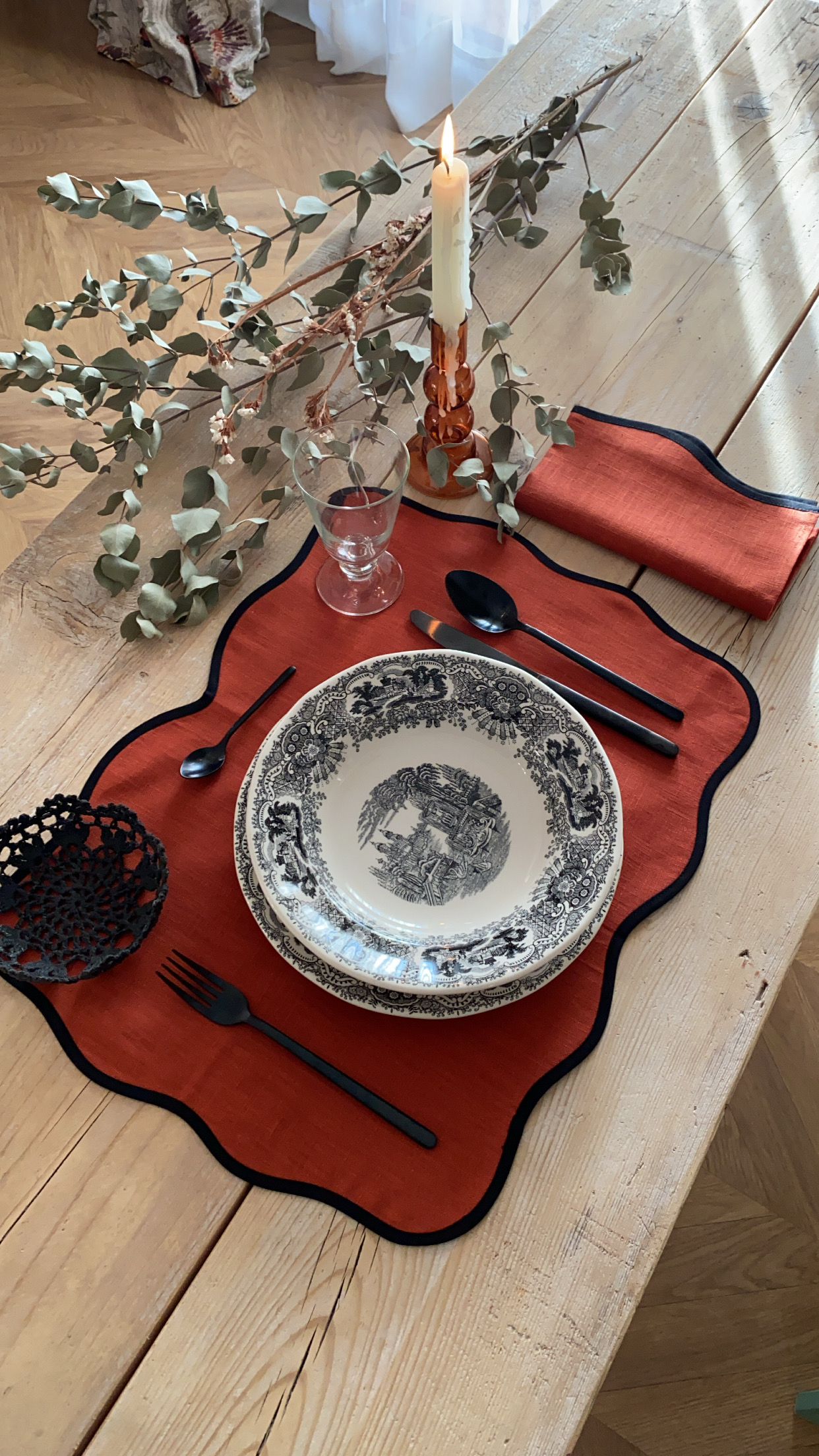 Descubre el encanto de la simplicidad con nuestro exclusivo Set Rectangular Luciana de lino teja con festón negro, diseñado por Espigas de Trigo para transformar cada comida en una experiencia especial. Confeccionado con lino 100% natural, este conjunto combina elegancia, tradición y funcionalidad, convirtiéndose en el complemento perfecto tanto para un uso diario refinado como para recibir a tus invitados con un toque de distinción.