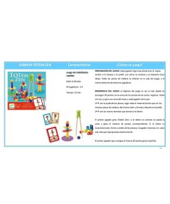 -Un juego de habilidad y rapidez. Primero, cada uno se apresura a coger las piezas de madera que necesita con los palillos. Luego, con mucho cuidado y delicadeza, intenta ser el primero en construir su tótem sin que se desplome.